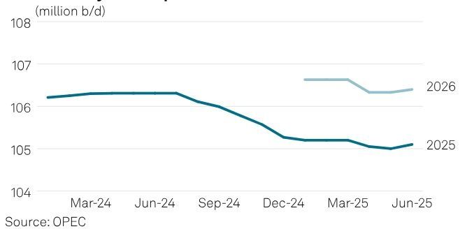 Συγκεκριμένα, στην τελευταία μηνιαία έκθεσή της για την αγορά πετρελαίου στις 16 Ιουνίου, η γραμματεία του ΟΠΕΚ στη Βιέννη προέβλεψε ότι η παγκόσμια ζήτηση πετρελαίου θα αυξηθεί κατά 1,29 εκατ. βαρέλια ημερησίως το 2025, από την εκτίμησή της του Μαΐου για 1,3 εκατ. βαρέλια ημερησίως, και άφησε αμετάβλητη την πρόβλεψή της για το 2026 στα 1,28 εκατ. βαρέλια ημερησίως.