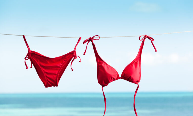 Subject: Bikini swimwear hanging on clothesline for drying, vacationing on tropical beach holiday.
