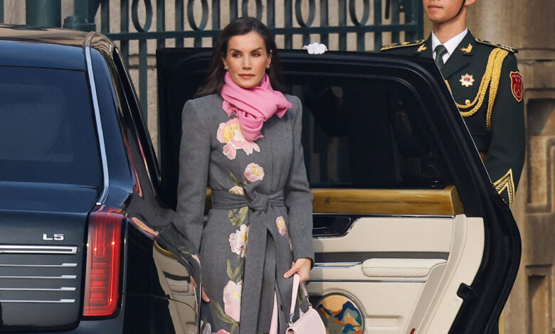 Η βασίλισσα Ράνια εντυπωσίασε στην επίσκεψή της στην Κίνα με ένα γκρι παλτό διακοσμημένο με κεντημένα λουλούδια, το οποίο συνδύασε αρμονικά με baby pink πασμίνα και αξεσουάρ στην ίδια απόχρωση. Αριστοκρατική κομψότητα με μοντέρνο twist.