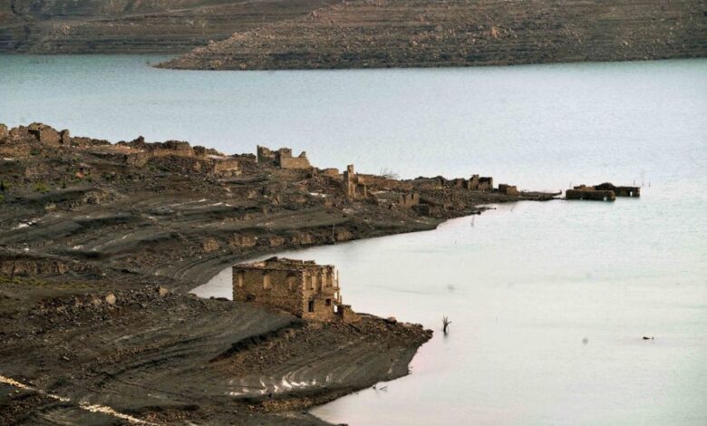 Ερείπια του χωριού Κάλλιο που έχει βυθιστεί στην Λίμνη του Μόρνου διακρίνονται στο στιγμιότυπο στις 28 Αυγούστου 2008