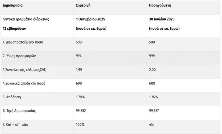 Συνολικά υποβλήθηκαν προσφορές ύψους 994 εκατ. ευρώ και η απόδοση διαμορφώθηκε στο 1,78%.