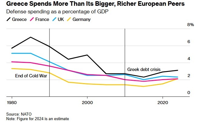 Η Ελλάδα είναι σταθερά μία από τις χώρες με τις μεγαλύτερες αμυντικές δαπάνες του ΝΑΤΟ, κυρίως λόγω της γεωγραφικής της θέση και της εύθραυστης σχέσης της με την Τουρκία.