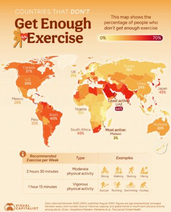 Με βάση τα πιο πρόσφατα δεδομένα από μελέτη που δημοσιεύθηκε το 2024 στο The Lancet Global Health, παρουσιάζεται η γεωγραφική κατανομή των χωρών ανάλογα με το ποσοστό του πληθυσμού που δεν πληροί τις βασικές προδιαγραφές σωματικής δραστηριότητας. Πιο συγκεκριμένα, οι ερευνητές ανέλυσαν στοιχεία από 507 εθνικές έρευνες ενηλίκων, συλλέγοντας πληροφορίες για την εβδομαδιαία φυσική δραστηριότητα. Ως ανεπαρκής ορίστηκε ως η μη επίτευξη των 150 λεπτών μέτριας ή 75 λεπτών έντονης άσκησης ή ενός ισοδύναμου συνδυασμού. Επιπλέον, αξιολογήθηκε κατά πόσο είναι εφικτός ο στόχος του ΠΟΥ για μείωση του φαινομένου κατά 15% μέχρι το 2030, με βάση τις τάσεις της περιόδου 2010-2022.