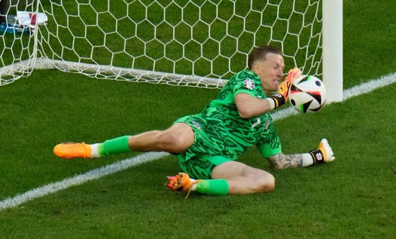 Ο τερματοφύλακας Τζόρνταν Πίκφορντ πιάνει ένα πέναλτι στον αγώνα Αγγλίας – Ελβετίας στο Euro 2024 στη Γερμανία