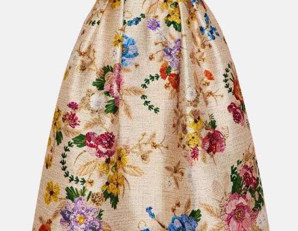 Η φιλοσοφία της Μαίρης Κατράντζου ξεδιπλώνεται σε κάθε λεπτομέρεια του φορέματος. Το ύφασμα μοιάζει με καμβά που «ζωντανεύει» μέσα από περίτεχνα λουλουδένια μοτίβα και λεπτεπίλεπες χάντρες που αντανακλούν το φως με διακριτική πολυτέλεια. Οι έντονες αλλά κομψές αποχρώσεις, τοποθετημένες με ακρίβεια ώστε να ακολουθούν τις γραμμές του σώματος, χαρίζουν βάθος και τρισδιάστατη διάσταση στη δημιουργία.