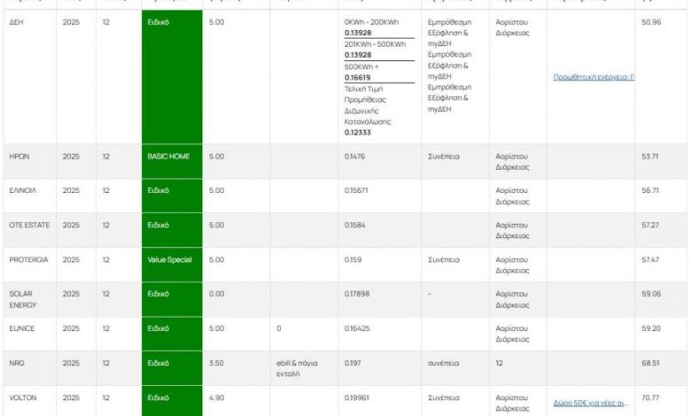 Όπως φαίνεται από τα τιμολόγια των παρόχων που αναρτήθηκαν στην ειδική πλατφόρμα της RAAEY, oι τιμές ξεκινούν από 13,9 και φτάνουν μέχρι τα 25,3 λεπτά ανά kWh.