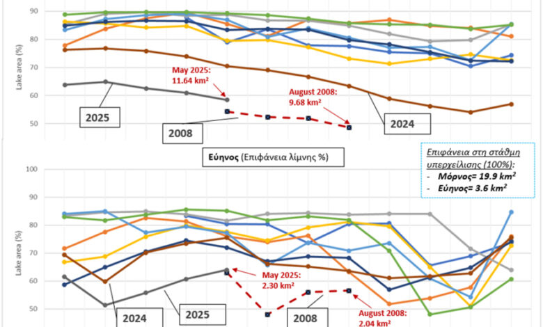 Συγκεκριμένα, η λίμνη του Μόρνου τον Μάιο του 2025 έχει μόλις το 65% της μέγιστης επιφάνειάς της για την εποχή, ενώ πριν δύο χρόνια ήταν σχεδόν γεμάτη. Αντίστοιχα, ο Εύηνος βρίσκεται κάτω από τα φυσιολογικά όρια, δείχνοντας ότι δεν μπορεί να ενισχύσει επαρκώς το σύστημα. Οι συνθήκες ξηρασίας, η χαμηλή χιονοκάλυψη και οι υψηλές θερμοκρασίες αυξάνουν την εξάτμιση και μειώνουν το νερό που φτάνει στους ταμιευτήρες.