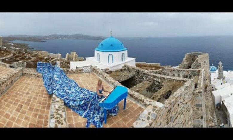 Στο επίκεντρο ένα εντυπωσιακό φόρεμα μήκους 20 μέτρων, εμπνευσμένο από την τέχνη των πορτογαλικών azulejos – τα περίτεχνα κεραμικά πλακάκια που αφηγούνται ιστορίες με χρώμα και ρυθμό. Το ύφασμα μετατράπηκε σε κινούμενο έργο τέχνης από τη σχεδιάστρια μόδας Μαρία Βυτινίδου, το οποίο ανέδειξε φορώντας το η πιανίστρια Έλενα Ξυδιά, ερμηνεύοντας μουσικά κομμάτια στα πιο μαγευτικά τοπία Ελλάδας και Πορτογαλίας. Στην Αστυπάλαια, με φόντο το Αιγαίο. Στο Κασκάις και στο Κάμπο ντα Ρόκα με την πλάτη στον Ατλαντικό. Σε κάθε της νότα, το φόρεμα ανέμιζε σαν σημαία που υπερασπίζεται το αύριο. Έντυσε το σώμα και τη δράση με ήχο, δίνοντας πνοή και συγκίνηση.