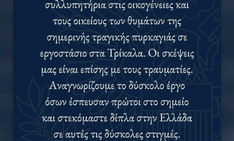 «Εκφράζουμε τα πιο ειλικρινή μας συλλυπητήρια στις οικογένειες και τους οικείους των θυμάτων της σημερινής τραγικής πυρκαγιάς σε εργοστάσιο στα Τρίκαλα. Οι σκέψεις μας είναι επίσης με τους τραυματίες. Αναγνωρίζουμε το δύσκολο έργο όσων έσπευσαν πρώτοι στο σημείο και στεκόμαστε δίπλα στην Ελλάδα σε αυτές τις δύσκολες στιγμές».