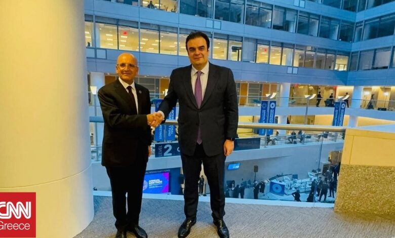 Συνάντηση με τον Υπουργό Οικονομικών της Τουρκίας, Mehmet Şimşek, είχε το πρωί της Πέμπτης (16/10) ο Υπουργός Εθνικής Οικονομίας και Οικονομικών, Κυριάκος Πιερρακάκης, στο περιθώριο της ετήσιας συνόδου του Διεθνούς Νομισματικού Ταμείου και της Παγκόσμιας Τράπεζας.