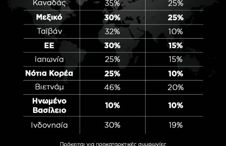 Μέχρι στιγμής, το Ηνωμένο Βασίλειο, η ΕΕ, η Ιαπωνία, η Νότια Κορέα, οι Φιλιππίνες, η Ινδονησία, το Βιετνάμ, η Καμπότζη, το Πακιστάν και η Ταϊλάνδη είναι οι χώρες που έχουν καταλήξει σε κάποιου είδους προκαταρκτική συμφωνία με τις ΗΠΑ «κλειδώνοντας» τους δασμούς σε χαμηλότερα επίπεδα. Κυρίως μεταξύ 15% – 25%.
