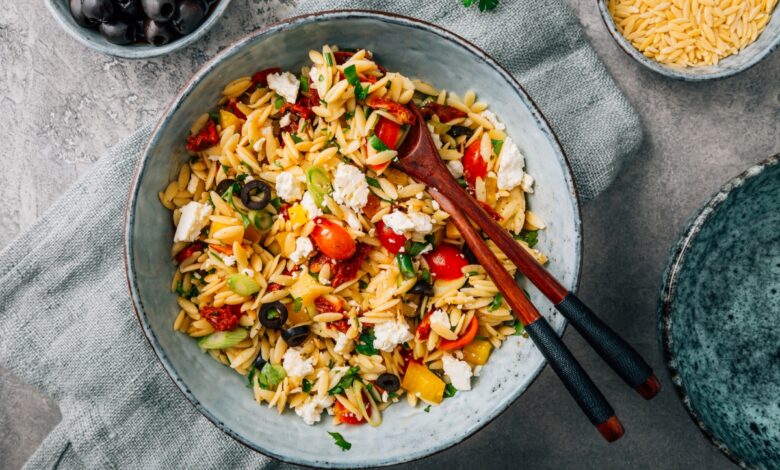 Έρχεται καύσωνας και η καλύτερη λύση είναι οι σαλάτες τόσο το μεσημέρι όσο και το βράδυ. Κι αν θέλεις μια χορταστική και ανάλαφρη θα συνδυάσεις το κριθαράκι με φέτα, ελιές και ντοματίνια.
