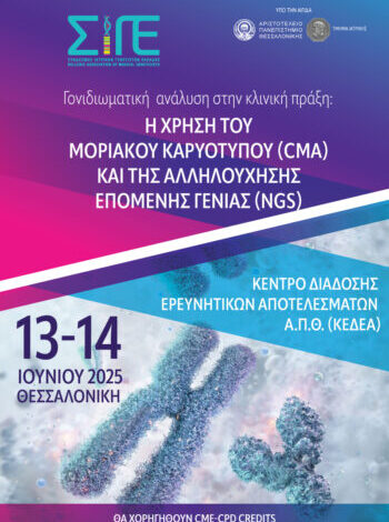 Ο Σύνδεσμος Ιατρικών Γενετιστών Ελλάδας (ΣΙΓΕ), σε συνεργασία με το Εργαστήριο Ιατρικής Βιολογίας και Γενετικής του Τμήματος Ιατρικής Α.Π.Θ., διοργανώνει το workshop «Γονιδιωματική ανάλυση στην κλινική πράξη: Η χρήση του μοριακού καρυότυπου (CMA) και της αλληλούχησης επόμενης γενιάς (NGS)», στις 13-14 Ιουνίου 2025, στο Κέντρο Διάδοσης Ερευνητικών Αποτελεσμάτων (ΚΕΔΕΑ) του Αριστοτελείου Πανεπιστημίου Θεσσαλονίκης.