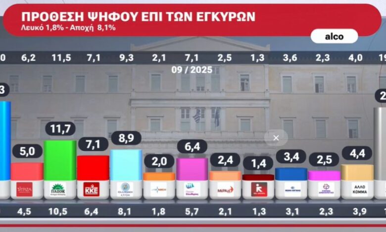 Δημοσκόπηση Alco: Πρώτη η ΝΔ – Εντυπωσιακά υψηλά ποσοστά για τους αναποφάσιστους