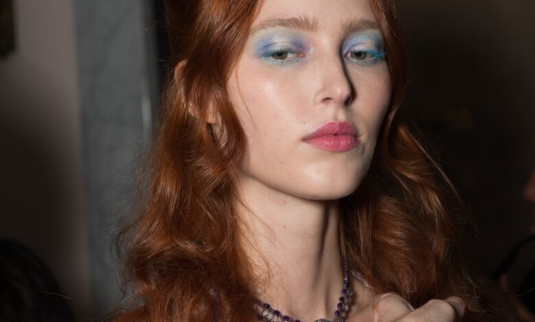 Το βλέμμα τονίζεται με έντονη, γαλάζια σκιά που απλώνεται σε όλη την επιφάνεια του άνω αλλά και κάτω βλεφάρου σε ένα ανατρεπτικό και φολκρόλ smoky eye που ταιριάζει πολύ με τις δημιουργίες. Τα χείλη είναι ροζ και η επιδερμίδα φυσική. Η λεπτομέρεια που θέλω να προσέξεις είναι το μπλε χρώμα στις βλεφαρίδες που επιβεβαιώνει ότι την επόμενη άνοιξη η μαύρη μάσκαρα θα μείνει στην άκρη. Εμείς απλά το λατρέψαμε.