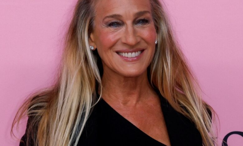 Sarah Jessica Parker: Με την αγαπημένη της γαλάζια και με shimmer σκιά και ροζ χρώμα στα χείλη με λαμπερό φινίρισμα. Τα μαλλιά της είναι μαζεμένα σε ένα chic half-up που της ταιριάζει πολύ.