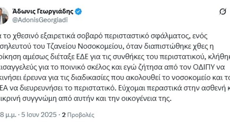 «Για το χθεσινό εξαιρετικά σοβαρό περιστατικό σφάλματος, ενός νοσηλευτού του Τζανείου Νοσοκομείου, όταν διαπιστώθηκε χθες η Διοίκηση αμέσως διέταξε ΕΔΕ για τις συνθήκες του περιστατικού, κλήθηκε ο εισαγγελεύς για το ποινικό σκέλος και εγώ ζήτησα από τον ΟΔΙΠΥ να ξεκινήσει έρευνα για τις διαδικασίες που ακολουθεί το νοσοκομείο και το ΕΚΕΑ να διερευνήσει το περιστατικό. Εύχομαι περαστικά στην ασθενή και ειλικρινή συγγνώμη από αυτήν και την οικογένεια της», ανέφερε ο κ. Γεωργιάδης σε χθεσινή ανάρτησή του στο «Χ».