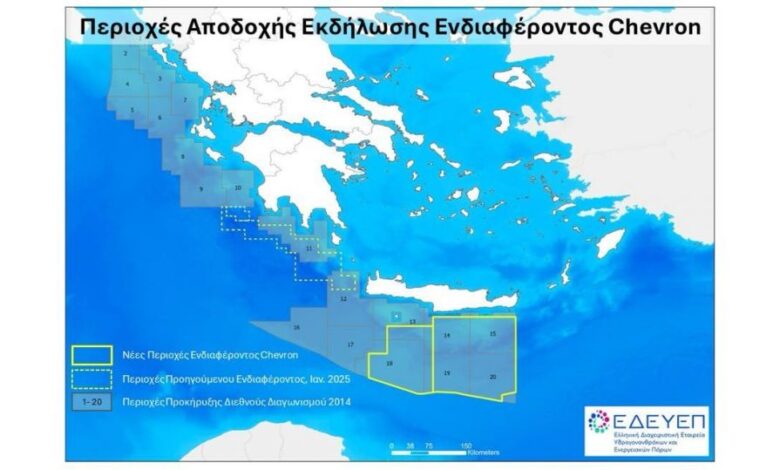 Υπενθυμίζεται πως η Chevron εκδήλωσε το ενδιαφέρον της για τα θαλάσσια οικόπεδα «Νότια της Πελοποννήσου», «Α2», «Νότια της Κρήτης I» και «Νότια της Κρήτης II» το πρώτο δίμηνο του 2025 και κατέθεσε την επίσημη προσφορά από κοινού με την HELLENiQ Energy στις 20 Σεπτεμβρίου.