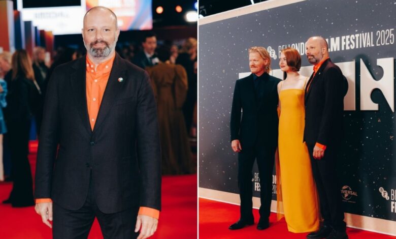 Ο Λάνθιμος μαζί με το καστ της ταινίας Bugonia στην προβολή στο Λονδίνο, με την καρφίτσα με σημαία της Παλαιστίνης σταθερά πάνω από το πέτο. (Φωτογραφία: Instagram/Bugonia)