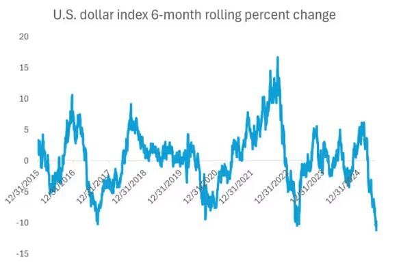 Ο δείκτης ICE U.S. Dollar Index υποχώρησε κατά σχεδόν 11% κατά τους πρώτους έξι μήνες του 2025, σημειώνοντας τη μεγαλύτερη πτώση κατά το πρώτο εξάμηνο ενός ημερολογιακού έτους που έχει καταγραφεί από το 1973.