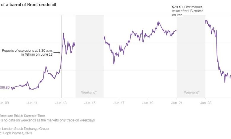 Οι τιμές του πετρελαίου αυξήθηκαν κατά την έναρξη του πολέμου και ξανά τη Δευτέρα μετά τα αμερικανικά πλήγματα κατά του Ιράν, αλλά τώρα έχουν μειωθεί με την είδηση της κατάπαυσης του πυρός.