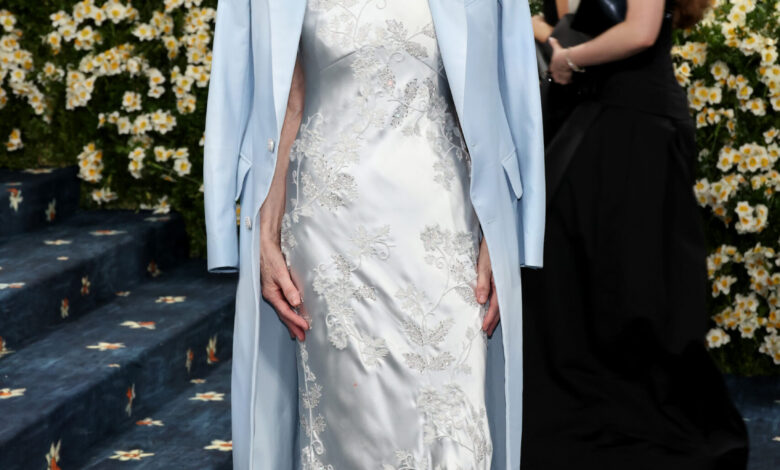 Η Anna Wintour φοράει gown και maxi coat σε σιέλ χρώμα δημιουργία αποκλειστικά για την βραδιά από τον Pharell Williams και τον οίκο Louis Vuitton.