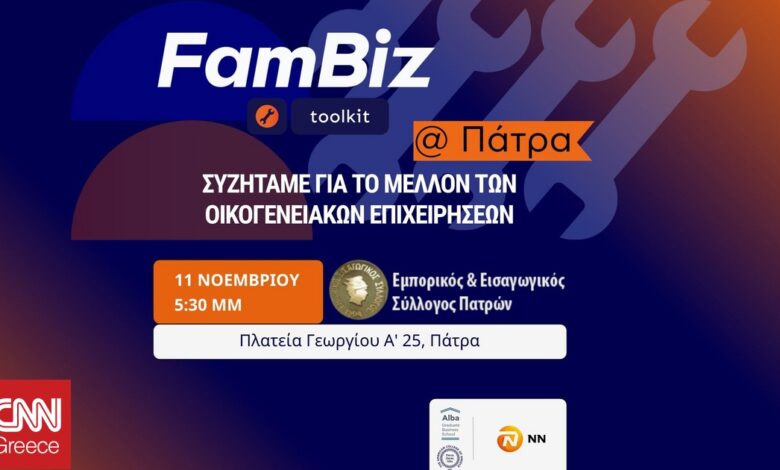 Στο πλαίσιο της επιτυχημένης πρωτοβουλίας FamBiz Toolkit, η NN Hellas και το Alba Graduate Business School, The American College of Greece, ανακοινώνουν την πρώτη τους εκδήλωση εκτός Αθηνών, με τίτλο «FamBiz Toolkit @ Πάτρα: Συζητάμε για το μέλλον των οικογενειακών επιχειρήσεων». Η εκδήλωση, που σηματοδοτεί την επέκταση του προγράμματος σε πόλεις της περιφέρειας, θα πραγματοποιηθεί την Τρίτη 11 Νοεμβρίου 2025, στις 17:30, στον χώρο του Εμπορικού και Εισαγωγικού Συλλόγου Πατρών.