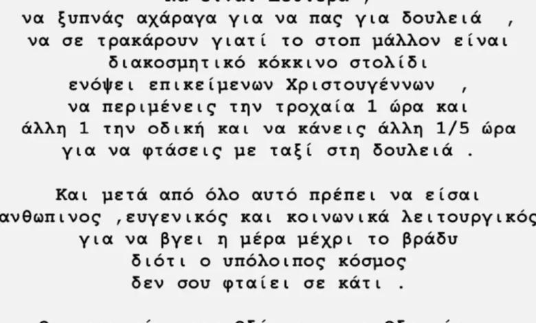 «Να είναι Δευτέρα, να ξυπνάς αχάραγα για να πας για δουλειά, να σε τρακάρουν γιατί το στοπ μάλλον είναι διακοσμητικό κόκκινο στολίδι ενόψει επικείμενων Χριστουγέννων, να περιμένεις την τροχαία 1 ώρα και άλλη 1 την οδική και να κάνεις άλλη 1/5 ώρα για να φτάσεις με ταξί στη δουλειά.