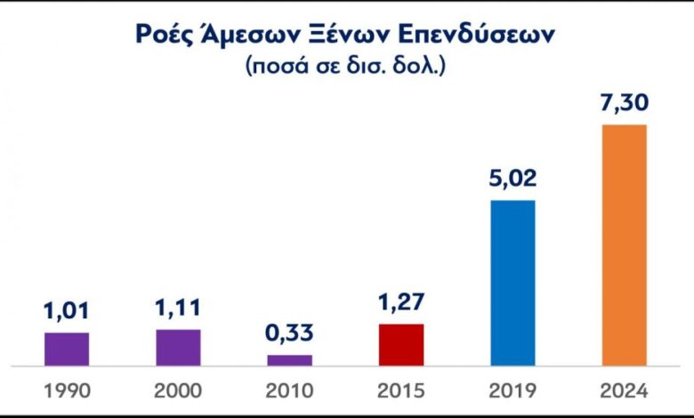 Σύμφωνα με την UNCTAD (Οργανισμός Εμπορίου και Ανάπτυξης του ΟΗΕ), η Ελλάδα το 2024 κατέγραψε την 2η καλύτερη επίδοση, από το 1990, στις Άμεσες Ξένες Επενδύσεις (η καλύτερη είχε καταγραφεί το 2022). Οι ροές Άμεσων Ξένων Επενδύσεων άγγιξαν τα 7,3 δις. δολάρια, καταγράφοντας αύξηση 41,5% σε σχέση με το 2023. Τα δε στοιχεία της Τράπεζας της Ελλάδος δείχνουν ότι η θετική αυτή πορεία συνεχίζεται και το α’ τρίμηνο του 2025.