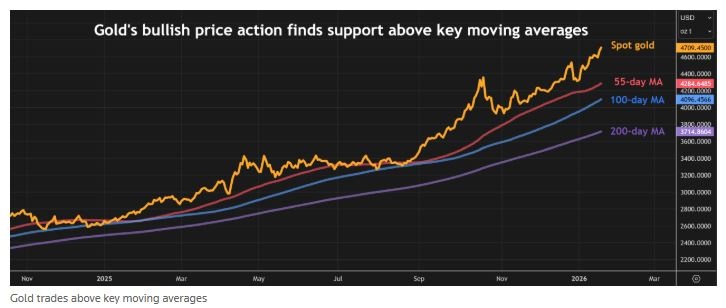 Συγκεκριμένα, ο χρυσός spot σημείωσε άνοδο 1,3% στα 4.727,99 δολάρια ανά ουγγιά, ενώ τα συμβόλαια μελλοντικής εκπλήρωσης του χρυσού στις ΗΠΑ για παράδοση τον Φεβρουάριο ανέβηκαν κατά 3% στα 4.734,10 δολάρια ανά ουγγιά.