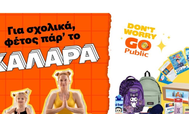 Το φετινό μήνυμα είναι ξεκάθαρο: “Για σχολικά, φέτος πάρ’ το χαλαρά. Don’t Worry, Go Public”.Με χιλιάδες επιλογές προϊόντων για κάθε τάξη, ηλικία και γούστο, αλλά και μοναδικές υπηρεσίες πληρωμής και παράδοσης, τα Public μετατρέπουν την προετοιμασία, πριν το πρώτο κουδούνι, σε μια πραγματικά άνετη εμπειρία.