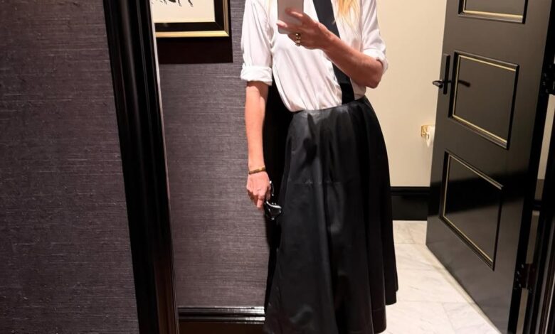 Η γραβάτα παραμένει το must-have αξεσουάρ της σεζόν, και η Gwyneth το αποδεικνύει. Με λευκό πουκάμισο, δερμάτινη midi φούστα και μαύρη γραβάτα, δίνει ένα σύγχρονο twist στο business chic, διατηρώντας το στυλ της αυστηρό αλλά καθόλου βαρετό.