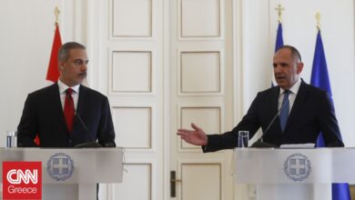 Το μήνυμα πως η Ελλάδα «δεν δέχεται υποδείξεις από κανέναν» στέλνει ο υπουργός Εξωτερικών Γιώργος Γεραπετρίτης στον Χακάν Φιντάν ο οποίος σε δηλώσεις…