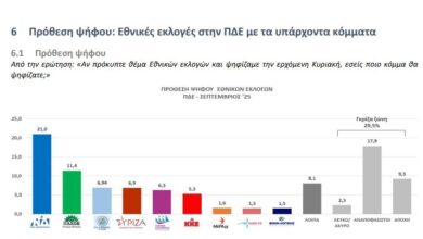 Πρώτο κόμμα παραμένει η Νέα Δημοκρατία, αλλά αποδυναμωμένη σε σχέση με το 2023 σύμφωνα με δημοσκόπηση που διενεργήθηκε στην Περιφέρεια…