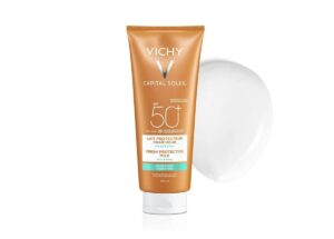 Ανάλαφρο γαλάκτωμα σώματος για ευαίσθητες επιδερμίδες Capital Soleil SPF50, Vichy. Ένα ενυδατικό αντηλιακό, σχεδιασμένο με ένα σύστημα φίλτρων ευρέος φάσματος που αποτελεί αποκλειστικότητα της Vichy. Χάρη στην υφή του, που είναι ανθεκτική στο νερό, μη λιπαρή και κατά των λευκών σημαδιών, προστατεύει αποτελεσματικά την επιδερμίδα από τις ακτίνες UV. H φρεσκάδα το καλοκαιρινού αρώματος με νότες λευκών λουλουδιών σε μια φρουτώδη βάση το κάνουν απολαυστικό σε κάθε εφαρμογή.