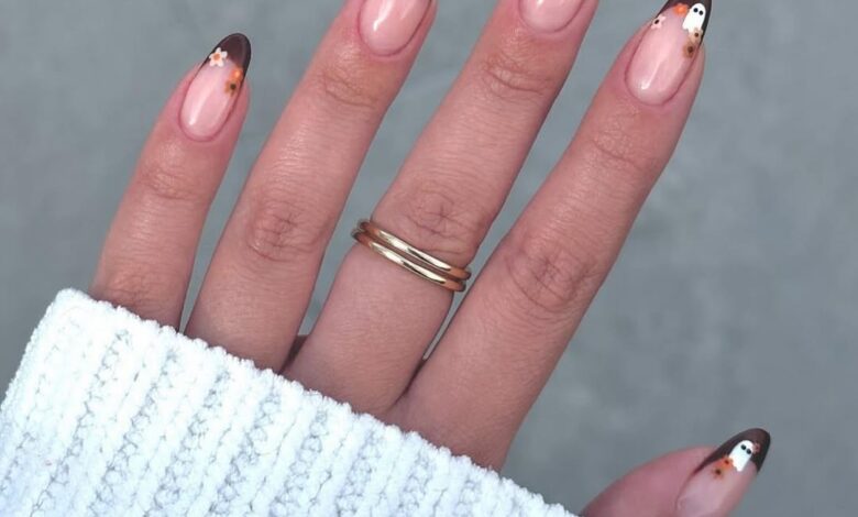 Γαλλικό μανικιούρ σε καφέ, φθινοπωρινές αποχρώσεις, διακοσμημένο με μικροσκοπικά λουλούδια και παιχνιδιάρικες φιγούρες-φαντάσματα – μια υπέροχα χαριτωμένη εκδοχή για Halloween νύχια!