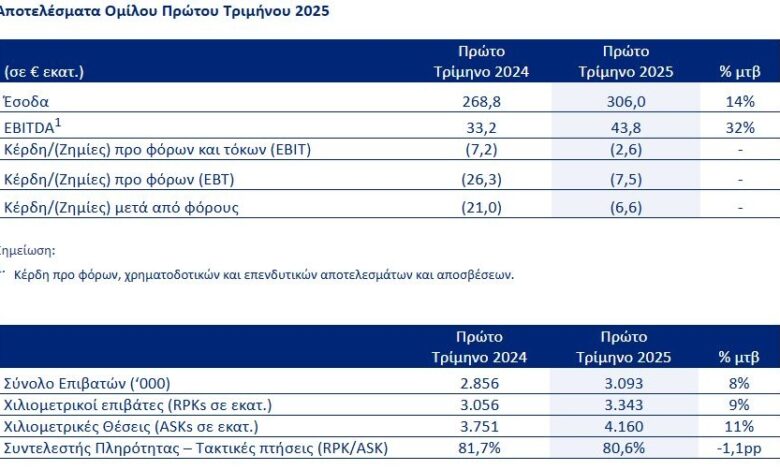 Η λειτουργική βελτίωση αποτυπώθηκε και σε επίπεδο EBIT, με τον περιορισμό των ζημιών σε 2,6 εκατ. ευρώ από 7,2 εκατ. ευρώ το πρώτο τρίμηνο του 2024. Οι ζημίες μετά από φόρους μειώθηκαν στα 6,6 εκατ. ευρώ έναντι 21,0 εκατ. ευρώ το 2024. Πέραν της βελτίωσης της λειτουργικής κερδοφορίας υπήρξε και θετική συνεισφορά στο πρώτο τρίμηνο από τη μεταβολή στην ισοτιμία του δολαρίου στην αποτίμηση των μελλοντικών υποχρεώσεων καταβολών για μισθώσεις αεροσκαφών.