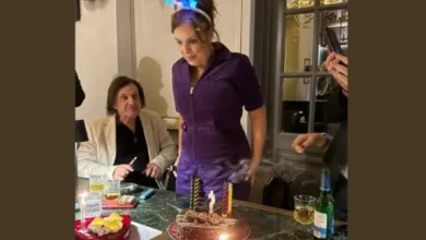 Η Ελένη Ράντου σβήνει κεράκια με στέκα-λαμπιόνια και τον Παπακωνσταντίνου δίπλα της