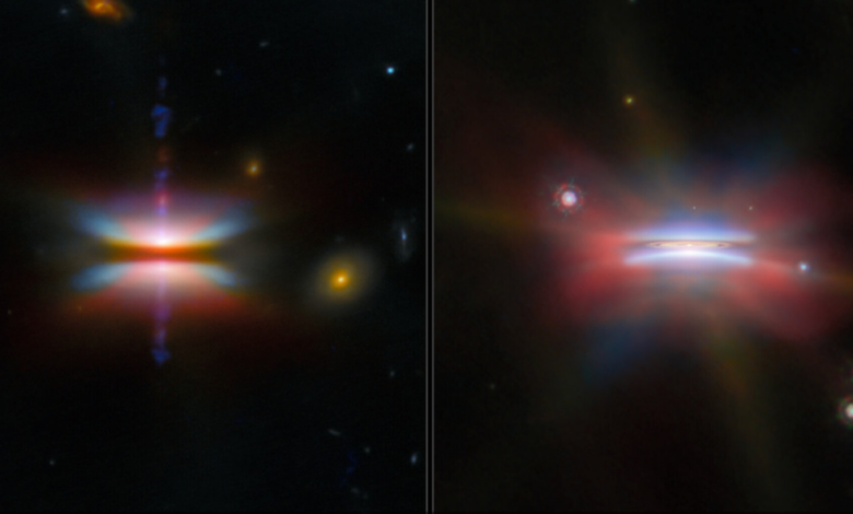 Το Διαστημικό Τηλεσκόπιο James Webb της NASA/ESA/CSA παρουσιάζει αυτόν τον μήνα μια εντυπωσιακή εικόνα που αποκαλύπτει δύο νεογέννητα άστρα, πιθανώς συνοδευόμενα από πλανήτες σε πρώιμο στάδιο σχηματισμού. Η φωτογραφία αναδεικνύει τους πρωτοπλανητικούς δίσκους Tau 042021 (αριστερά) και Oph 163131 (δεξιά), γνωστούς και με τους καταλόγους 2MASS J04202144+2813491 και 2MASS J16313124-2426281 αντίστοιχα. Ο πρώτος βρίσκεται περίπου 450 έτη φωτός μακριά, στον αστερισμό του Ταύρου, ενώ ο δεύτερος απέχει γύρω στα 480 έτη φωτός, στον Οφιούχο.