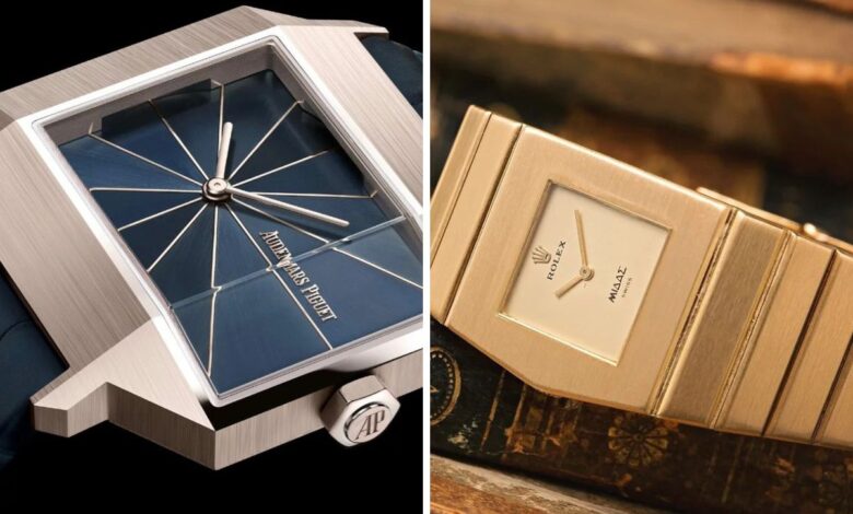 Το Audemars Piguet [Re]Master02 (2024) είναι από τα πιο χαρακτηριστικά μπρουτάλ ρολόγια. Δεξιά: Το Rolex King Midas, δημιουργία του θρύλου Gérald Genta.
