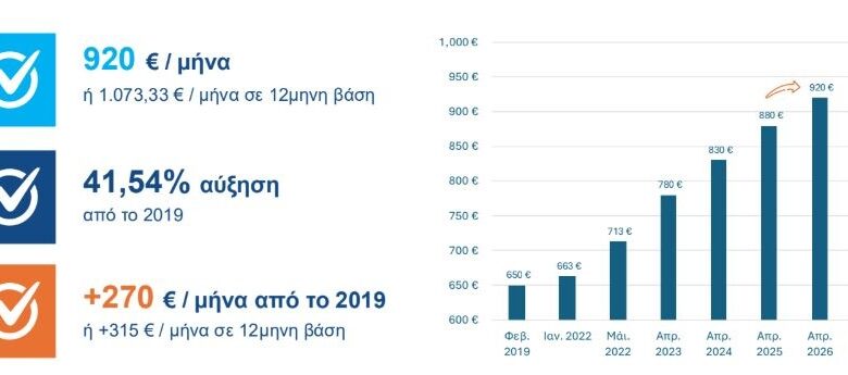 • Καθαρή ετήσια αύξηση σε σχέση με το 2025 (14 μισθοί): 756 ευρώ