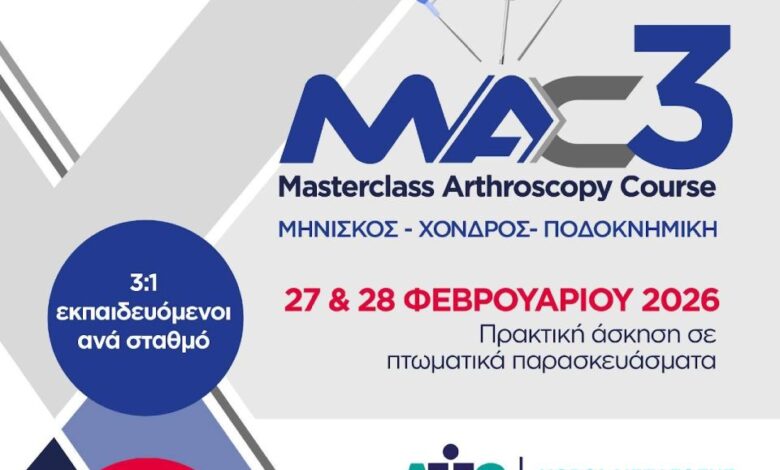 Με μεγάλη επιτυχία ολοκληρώθηκε το εκπαιδευτικό σεμινάριο «MAC 3: Masterclass Arthroscopy Course», το οποίο πραγματοποιήθηκε στις 27 και 28 Φεβρουαρίου 2026, με το θεωρητικό μέρος να διεξάγεται την Παρασκευή 27 Φεβρουαρίου 2026 στο Συνεδριακό Κέντρο «Ν. Λούρος» και το πρακτικό μέρος το Σάββατο 28 Φεβρουαρίου 2026 στο ATT Center, στο Μαρούσι.