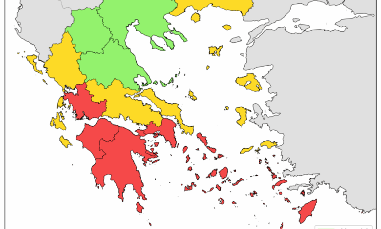Για το υπόλοιπου του Ιουλίου στο κόκκινο είναι πέντε περιφέρειες: Αττική, Πελοπόννησο, Δυτική Ελλάδα, Κρήτη και Νότιο Αιγαίο.