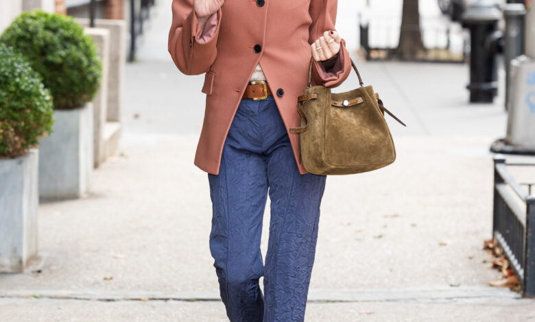 Η ηθοποιός εμφανίστηκε πρόσφατα με ένα σακάκι σε υπέροχη peach pink απόχρωση, χωρίς πέτα, σε μήκος μέχρι τη μέση, που τόνιζε τη λεπτή της σιλουέτα.