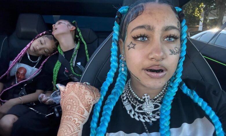Ψεύτικα piercing και τατουάζ, μπλε φακούς επαφής, μακριές κοτσίδες, αλυσίδες και μαύρα δόντια είναι μερικά απ’ όσα θα τραβήξουν την προσοχή σου, χαζεύοντας τις αναρτήσεις της. Η North West άλλοτε χορεύει μόνη και άλλοτε δείχνει το ιδιαίτερο look της μαζί με τις συμμαθήτριές της, που είναι παρόμοια ντυμένες και βαμμένες.