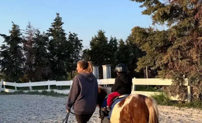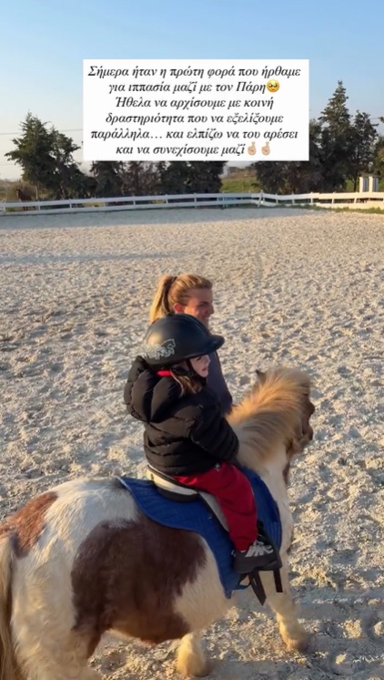 «Ξεκινάμε χτενίζοντας τα άλογα και κάνοντας βόλτα στον στάβλο, μέχρι να νιώσει έτοιμος να ανέβει στο πόνυ του», ανέφερε αρχικά η Ιωάννα Τούνη στην πρώτη φωτογραφία με τον γιο της, Πάρη.