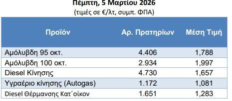 Σύμφωνα με το πιο πρόσφατο δελτίο επισκόπησης τιμών υγρών καυσίμων (5/3), οι μέσες τιμές λιανικής πώλησης για όλη την Ελλάδα διαμορφώνονται στα 1,788 ευρώ/λίτρο (συμπ. ΦΠΑ) για την αμόλυβδη των 95 οκτανίων και στα 1,997 ευρώ/λίτρο για τα 100 οκτάνια.