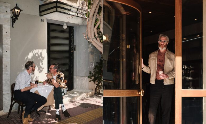 Καφενείο, Φιλίππου, Ράτκα, L’Abreuvoir είναι οι ωραίες vintage διευθύνσεις για φαγητό στο Κολωνάκι. Πουκάμισο και παντελόνι Officine Générale, γυαλιά Spektre.