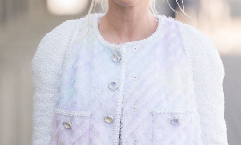 Στην εμφάνιση με το λευκό Chanel σακάκι και τη φούστα, τα μαλλιά της ήταν χαλαρά πιασμένα σε χαμηλό ban, με wet υφή και ελαφρώς ατημέλητο σπάσιμο. Αυτό το messy hairstyle με λάμψη έδωσε ένα cool, effortless vibe στο αυστηρό couture σύνολο.