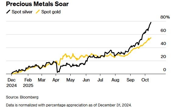 Ο χρυσός σημείωσε μια εντυπωσιακή άνοδο από την αρχή της χρονιάς, ωστόσο το ασήμι είναι αυτό που κλέβει την παράσταση στις αγορές, καθώς το πολύτιμο μέταλλο εκτινάχθηκε κατά 70% στην αγορά του Λονδίνου φέτος, σε σύγκριση με την άνοδο 55% του χρυσού μέχρι τα μέσα Οκτωβρίου.